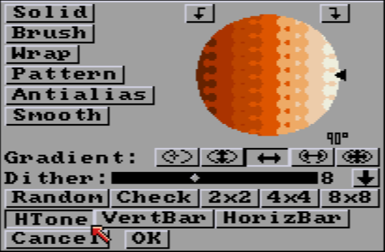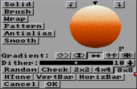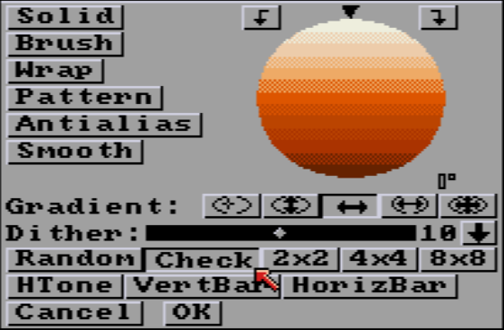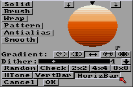 Tip: Set Dither value at 2 to produce a basic line alternate with Vert or Horiz Bar which is interesting in any Gradient type.